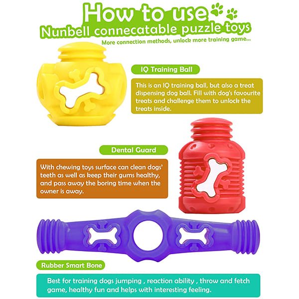 Nunbell connectable toys are smart, stimulating, and challenging for your dog’s brain while the challenging dog game teaches dogs problem solving